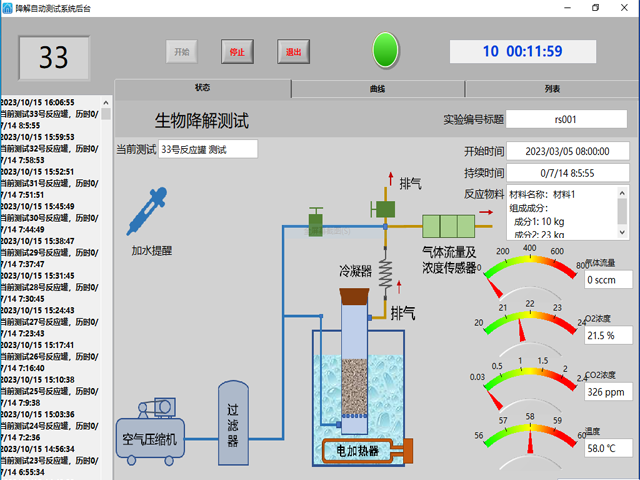 本系统可检测多个反应容器内需氧生物降解反应所产生的反应气体,对二氧化碳生成量进行记录并存储,可实时查看各个反应容器内实验材料以及降解程度。